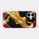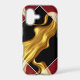 Encase your device in regal luxury with the Achempong: The Royal Flow Liquid Gold Black iPhone 17 Case. This striking abstract design merges opulent liquid gold, smooth cream waves, and a dramatic black background, framed dynamically by a white-bordered diamond shape set against a rich crimson field. The flowing, molten aesthetic creates a mesmerizing sense of high-contrast movement and modern luxury. This visually stunning art piece evokes a sophisticated, rich ambiance, showcasing high-end abstract art as a functional luxury mobile accessory.