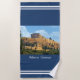 70” x 35” blue beach towel with an image of the glorious Parthenon atop the Acropolis and the arches of the Herodes Atticus amphitheatre below in Athens, Greece. Double white stripe borders. See the entire Greece Beach Towel collection in the HOME section.