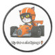 The challenge of a black and white cat, manoeuvring a fast orange racing car, with a racing helmet .