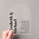 This modern acrylic wedding Invitation can be clear or frosted, rectangle or arch shaped as desired to suit your needs. You can change the colour of the text in design tools.