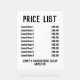 Acrylic price-list for any business such as a nail bar, beauty salon, hairdresser or barber shop. Alter prices as you wish. Displays up to 9 items and prices. Black and white.