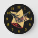 Clock with dancer and the word Dance with large yellow star, and gold numbers on black background. Colour of background and numbers can be customised. Red swirl can be removed.