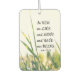 Inspirational quote scripture air freshener depicts a nature photograph of a meadow with green blades of grass and wildflowers. It features an encouraging Bible Verse, Acts 17:28, "In Him we live and move and have our being."
