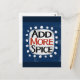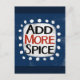 A chunky cute typographic piece that says "Add More Spice". It has black and red text on a white rectangle with funky, playful white dots surrounding it, all on a blue background.