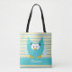 All over patterned tote bag with chevron stripes of yellow, blue, and white with a blue owl and an area you can easily add a name!
