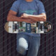 Customisable skateboard with a photo template to which you can add twelve of your own photos and your name in a distressed grunge font against a navy blue background. Cool photo collage skateboard personalised with your name and 12 photos in different sizes and shapes. Show off your favourite pics as you skate with this personalised skateboard printed with your name and your twelve favourite photos, perhaps of yourself skating, your pet, your crush, and your family.