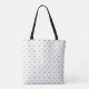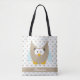 All over patterned tote bag with a background of little owls of clay and blue colour with a larger owl on front, and an area you can easily add a name before ordering.