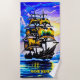 Add Name, Stylised Brown Pirate Sailing Ship Blue Beach Towel