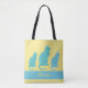 All over patterned tote bag with cream polka dots on yellow and three blue cats with a blue stripe where you can add a name easily before ordering!