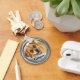 Add your photo into the silver metal look template border frame and add your own text easily to personalise this cute keychain. Upload your special photo and make your own custom keychain today! Shown is a pet picture on an affordable round key chain. Add your dog or cat photograph, or any photo or image, as well as his or her name onto the matching silver metal (printed) look nameplate.