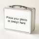 This is a standard metal lunchbox that appears to work just fine. We designed this box ourselves with an uploaded photo and custom text on the front and back. It looks absolutely beautiful except the front of the lunchbox is not centered like it shows in the photo. The print borders don't align with the inset flat part of the box where the preview photo online showed it perfectly centered in there. The back looks nice and centered though.