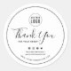 This sticker has a white background and black round border with the words "Thank You" in calligraphy script and where you can also add your social media handles and hashtags and website address to get your customers to connect with you online.