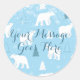 Classic round stickers featuring cute polar bears with falling snowflakes on an ice blue background with your message set in a bluey-grey script font. Perfect for envelope seals and gift labels.