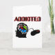 Side profile of a man’s face, sectioned to revile a brain in primary colours with added pink flesh area. All with a video game remote control plugged into the back of the brain. Word, “Addicted” written in large red & black font.