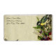 Matching Shipping Address Return Business or Wedding Labels. Great to seal envelopes or gift bags. COLOR PALETTE: yellow, tan, cream, orange, green, and black. DESIGN: This antique vintage typography inspired wedding invitation set or collection has a complete ensemble of products and has been created in several colorways. Using vintage printer's ornament decorative swirls from the baroque Victorian era, mixed with postcard flower art including lily of the valley, english violets, roses and snap dragon blossoms. A pair of yellow song birds with an open bird cage completes the front of the invite. The reverse side includes your text, which is easily customised using the template fields for personalising. There are more swirled flourish designs, swirled line work, aged, grunged border edges and the birdcage and roses. This is a mix of vintage design elements and original watercolor backgrounds graphically designed into new art work by Audrey Jeanne Roberts.