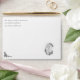Design features Bride's return address in an elegant, silver-coloured Nuptial font. The image of roses and greenery decorate the bottom left corner in same silver-colour, while the image of Our Lady of Fatima graces the right corner. Reverse displays the monogram of bride and groom. The initial of couple's last name also appears inside with the image of two delicate roses.