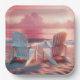 Two white wooden Adirondack chairs on beach sand facing a serene ocean with a mesmerising sunset