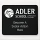 Adler School mousepad with black and white logo and "Become A Social Action Hero"