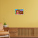 Decorate your walls in style with this unique, colourful folk art poster. In this cute, whimsical artwork, three curious cats are sitting in the candy-cane framed window and on the perfectly-spiced roof of a tasty Taos style adobe gingerbread house in the American southwest. A candy cane cactus and multicolored gumdrops in candied citrus pots, as well as peppermint ceiling beams, frosted gingerbread pine trees, and other assorted goodies accent the house and yard, providing a welcome contrast to the desert sand. Purple mountains and greenery brighten the background beneath a cloudless bright blue sky. This poster would make great wall decor for the holidays or any time.
