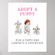 Fun and cute sign for your child's firefighter theme birthday party! It's an adoption centre poster sign for a birthday activity to adopt stuffed animals. Have a variety of stuffed animals as party favours for kids to take home and "adopt a pet." Features illustration of Dalmatian dogs with red fireman helmet and pink party hats. The text says "adopt a puppy."
