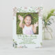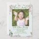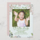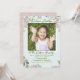Older girl adoption party invitations with photo template. Mint and pink floral border invitations with wording to welcome a daughter to the family. Include her name at the top with family name beneath the picture. All party information is printed and colours are green and pink. Perfect for welcoming a child of any age, from baby girl to teenager. Comes as a printed announcement with paper upgrades, or choose the download option.