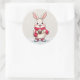 a whimsical cartoon sticker featuring a vector-style illustration of a chubby, adorable baby bunny with a bright, cherry-red scarf wrapped around its neck, standing on its hind legs, and wearing a pair of tiny, snow-covered boots, holding a miniature marshmallow-topped hot chocolate cup in its paws, with a joyful, toothy grin on its face, set against a flat, soft, and creamy white background that resembles freshly fallen snow, with the overall aesthetic evoking a sense of winter wonderland charm and cuteness.