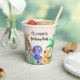 This is an adorable dinosaurs themed birthday paper cup for a little boy's birthday party. The design consists of four whimsical dinosaurs, foliage and a volcano. The paper cup can be personalised by changing the name and age on the cup.