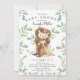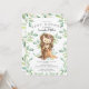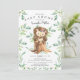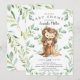 Cute baby shower invitation featuring sweet baby hedgehog with mom sitting on a tree stump and framed with natural green watercolor leaves set on a white background. Flip our invite over to view a matching green leaf back for an extra special touch..