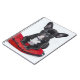 Adorable black and white bulldog puppy sat on a regal red cushion.