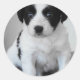 Cute portrait photograph of a black and white puppy sitting obediently for the camera.