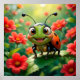 A delightful cartoon ladybug with smiling features, perched on a green leaf surrounded by vibrant red flowers in a sunny garden. The cheerful atmosphere captures the essence of nature's charm and whimsy.