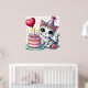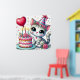 A cute grey cat wearing a party hat, sitting next to a decorative pink cake, accompanied by a lovely heart-shaped red balloon on a colourful background, radiating joy and festivity.