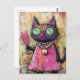 A cute purple kitty wearing a pink dress and pearls with a drink in hand