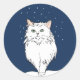 Sticker with adorable white Chinchilla Persian cat with green eyes walking on snow at night. The design is customisable.