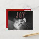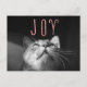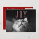 An adorable grey tabby cat looks up towards the word JOY spelled out in candy canes An extra cute image with a bit of whimsy! A fun and unique way to get your Christmas spirit in full gear!