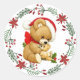 Round sticker featuring lovely Christmas wreath and adorable teddy bear wearing a santa hat and holding his baby.