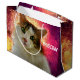 Portrait of a cute and adorable calico cat with green eyes, pink nose, and multicolor fluffy fur. The beautiful pet looks straight into your eyes. A digital painting from a photograph. Elegant and funny two-sides printed gift bag for anyone. Customisable. You can change the image. You can use the image of your own cat instead of the template image if you wish. You can change or delete two template texts PURR and MEOW independently on both sides of the bag. You can transfer this design to a variety of other products of your choice. Please, use the "Edit Design" or the "Personalise" (as the case may be) button to adjust the picture to the shape of the particular product. It will transfer you to the Designer Tool. Use the "Fit/Fill" option (right-side menu of the Designer Tool). You can scale, rotate, flip the image on the product template, and you can add some text of your own to it. You can also change the type, size, colour, and location of the font. Just be creative, buy one, have fun, and be happy!