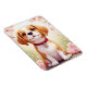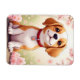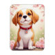 This charming illustration features an irresistibly cute puppy with soulful, sparkling eyes and a gentle smile. The puppy, with its soft brown and white fur, wears a bright red collar adorned with a name tag, adding a touch of personality and warmth. Seated calmly amidst a serene garden of delicate pink cherry blossoms, the puppy gazes sweetly forward, evoking a sense of peace and joy.