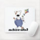An adorable white and brown spotted dog with a chubby belly wearing denim overalls flies a kite and black text reads "Adorable".