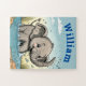 Adorable Elephant Name Jigsaw Puzzle features a delightful scene of a playful elephant in a pond, Adding the first name to personalise makes it a special gift!