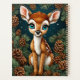 Charming illustration of a cute baby deer at the centre of festive pinecones and branches, perfect for holiday or nature themes highlighting warmth and beauty of wildlife.