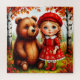 An enchanting fairy-tale illustration portrays a smiling girl and a bear sitting amidst birch trees and autumn leaves, evoking warmth, friendship, and magical charm.