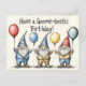 Celebrate in style with this charming illustration featuring three cheerful gnomes holding colorful balloons in red, blue, and yellow. The playful design includes the fun text 'Have a Gnome-tastic Birthday!' in a whimsical, hand-drawn font on a soft cream background.