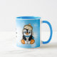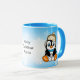 A cute funny hand drawn cartoon penguin with snowballs and snowflakes background. Personalised coffee mug.