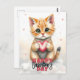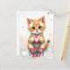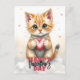 This customisable Valentine's Day postcard features an adorable illustration of a cute, fluffy kitten holding a heart. The kitten has a soft, warm colour palette with shades of orange, white, and brown, and is surrounded by small, floating pink hearts. The text "HAPPY Valentine's DAY" is prominently displayed at the bottom of the postcard in a playful, bold font with "HAPPY" ans d "DAY" in red and "Valentine's" in black cursive. The text on the front and on the back is fully customisable, allowing you to add your own personal message or greeting to make it unique and special for your loved ones. This charming and heartwarming design is perfect for expressing your affection on Valentine's Day.