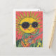 An adorable yellow sunshine wearing sunglasses and playing a guitar with a pink background and green plants AI generated