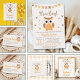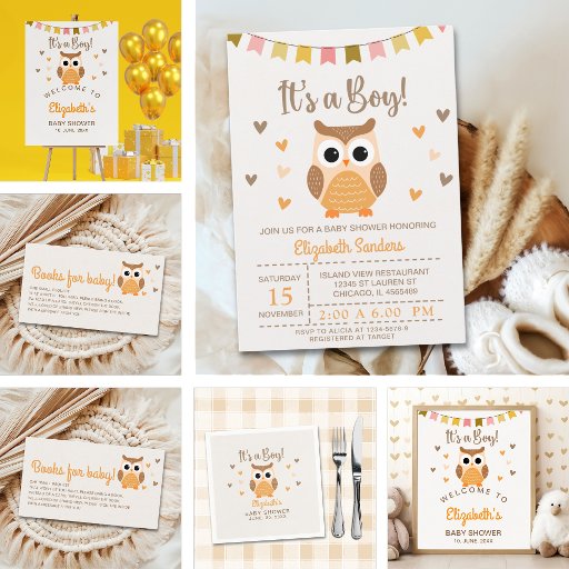 "Celebrate in style with this cute boho owl themed baby shower design! Featuring the phrase 'It's a Boy' in warm shades of brown and orange, it's perfect for welcoming your little one." For complementary products please see the collection of this cute baby boy shower design.