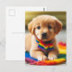 AI generated art of an adorable puppy laying on a rainbow blanket and wearing a cute rainbow collar