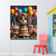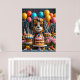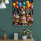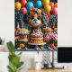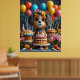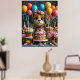 A cute dog adorned with a flower crown enjoys a vibrant birthday party featuring colourful cakes, balloons, and cheerful decorations, evoking joy and celebration in a festive atmosphere.
