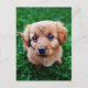 Adorable portrait photograph of a puppy sitting in the grass staring up at the camera.